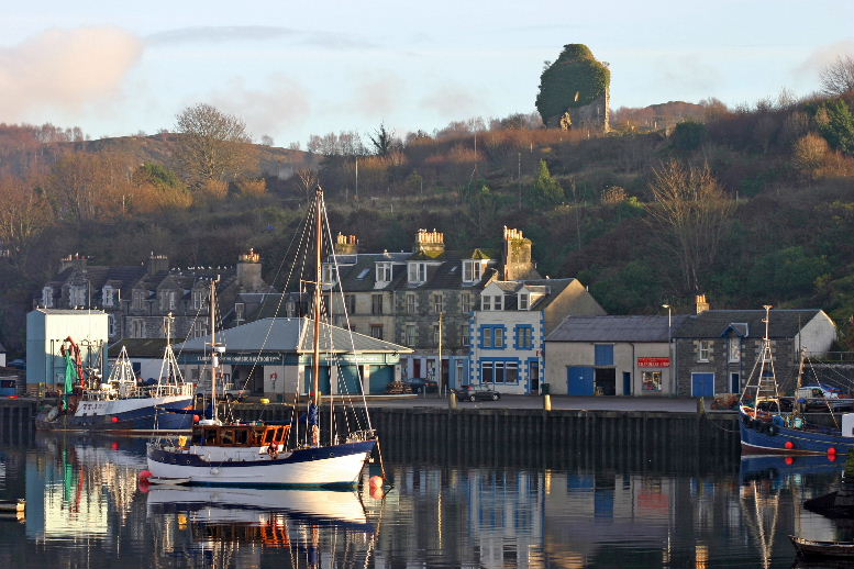 Tarbert with the historic ruins of Tarbert Castle on the hill